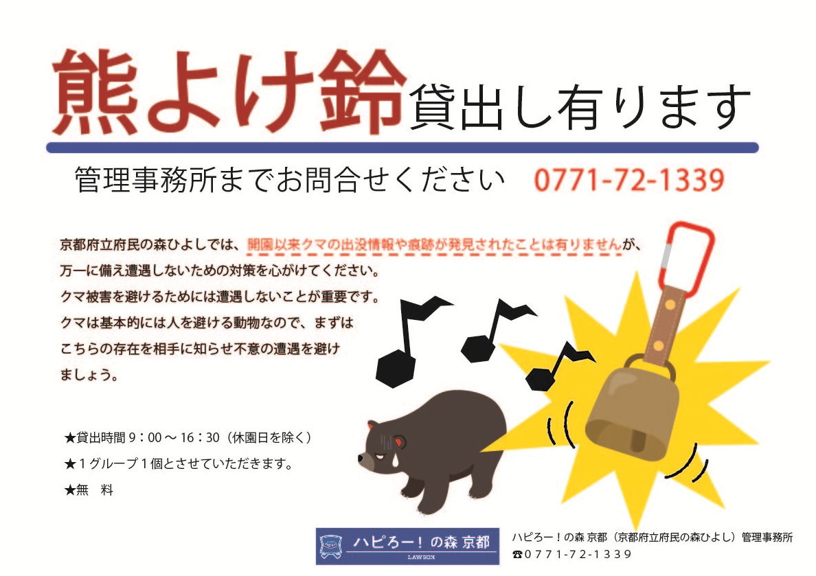 ハピろー!の森 京都では、「熊よけ鈴」の無料貸出しを行っております。ご希望の方は、管理事務所までお問合せください。